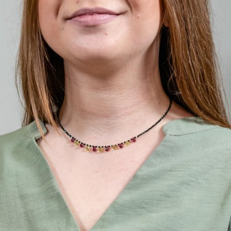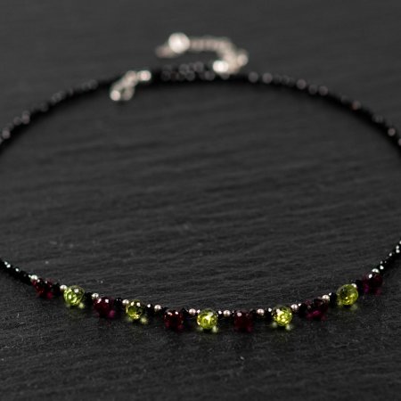 Collier en spinelle noir, grenat et péridot avec fermoir et chainette de rallonge en argent 925.